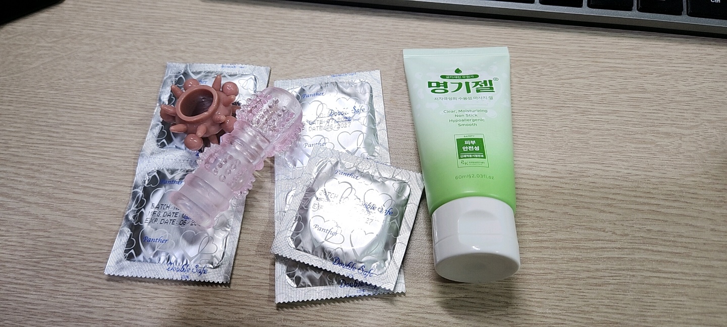콘돔을 착용하고 사은품으로 온 젤을 살짝 짜서 공기를 뺀 다음에 넣어봅니다.